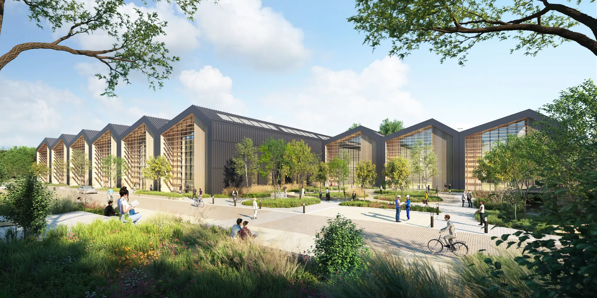 The design creates a clear distinction between pedestrianised public spaces and service areas with vehicular access by dividing and extruding the floorplan across an east west axis. A sawtooth roof both unifies and defines nine individual mid-tech units, each benefitting from a private entrance and views out across extensive landscaping to the south. Provision of individual units combined with a flexible layout ensures the building will be fully equipped to accommodate multi-tenancy and meet a variety of spatial requirements now, and in the future.