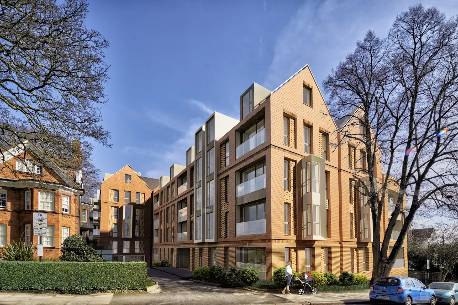Hampstead Manor, on Kidderpore Avenue, for Mount Anvil delivers 156 homes through the conversion of five Grade II listed buildings including Kidderpore Hall (a Georgian mansion built by an East India Company merchant) and a chapel, two non-listed buildings and newly built one, two and three bed apartment blocks, together with townhouses.