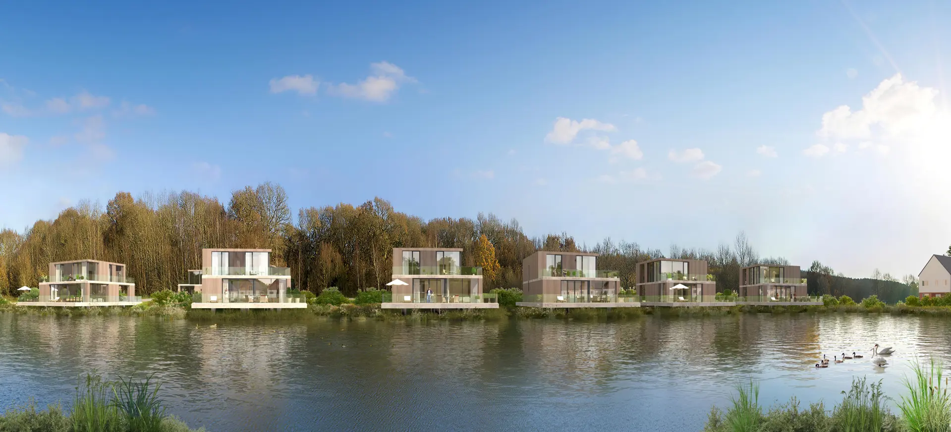 The design principles adopted revolve around the central water feature and how the plots respond to this setting with detached housing volumes to maximise visual permeability, balanced transparency of façades towards the water, and principal aspect/façade and living spaces facing the lake.