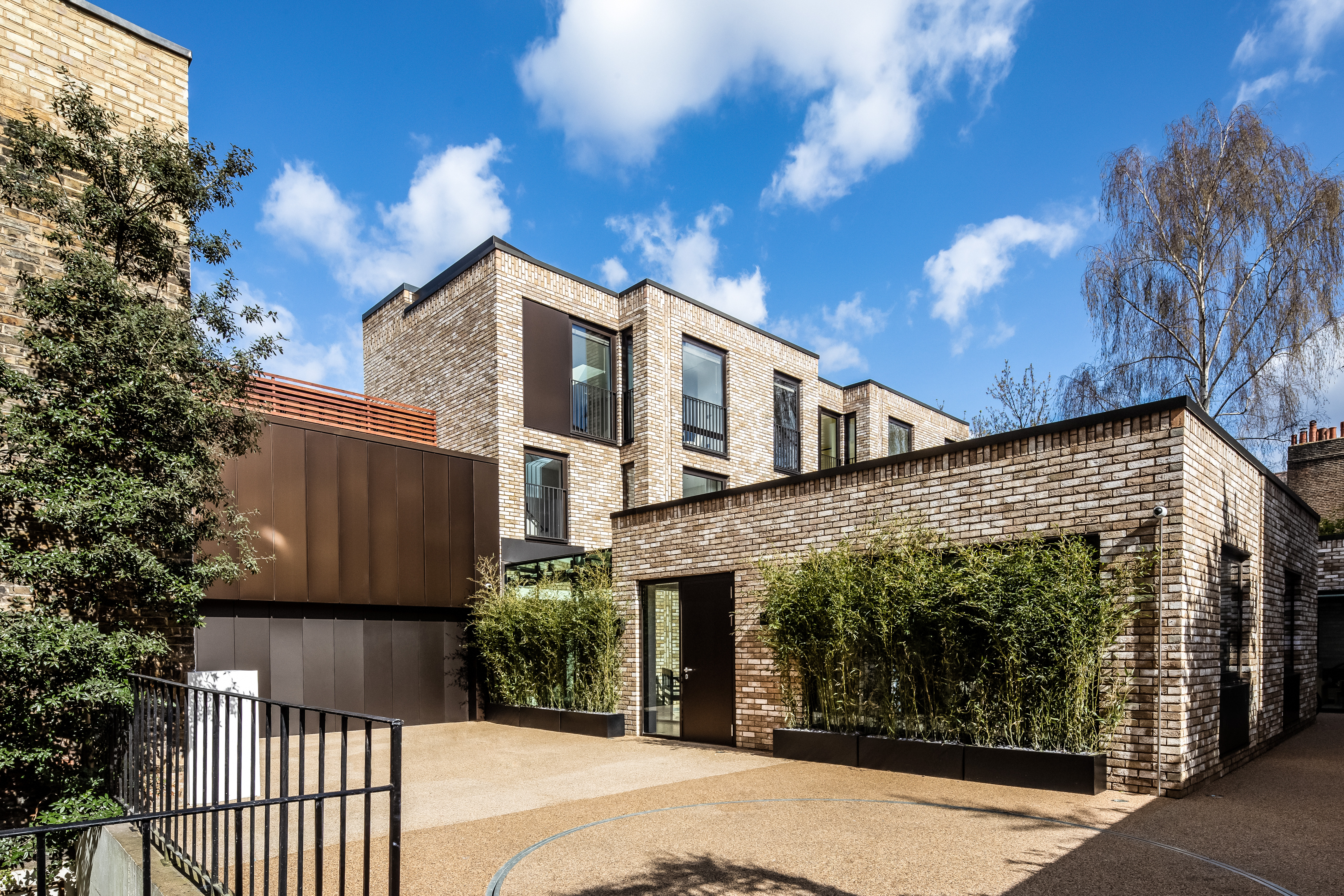 Conceived as two co-located elements, the 759 sq m townhouses are positioned around a courtyard to introduce light, space and privacy on a site tucked away from Old Church Street. A modern interpretation of a traditional Chelsea townhouse, their design is contemporary and light, with clean lines and form complemented by high quality materials: brick and bronze anodised aluminium cladding.