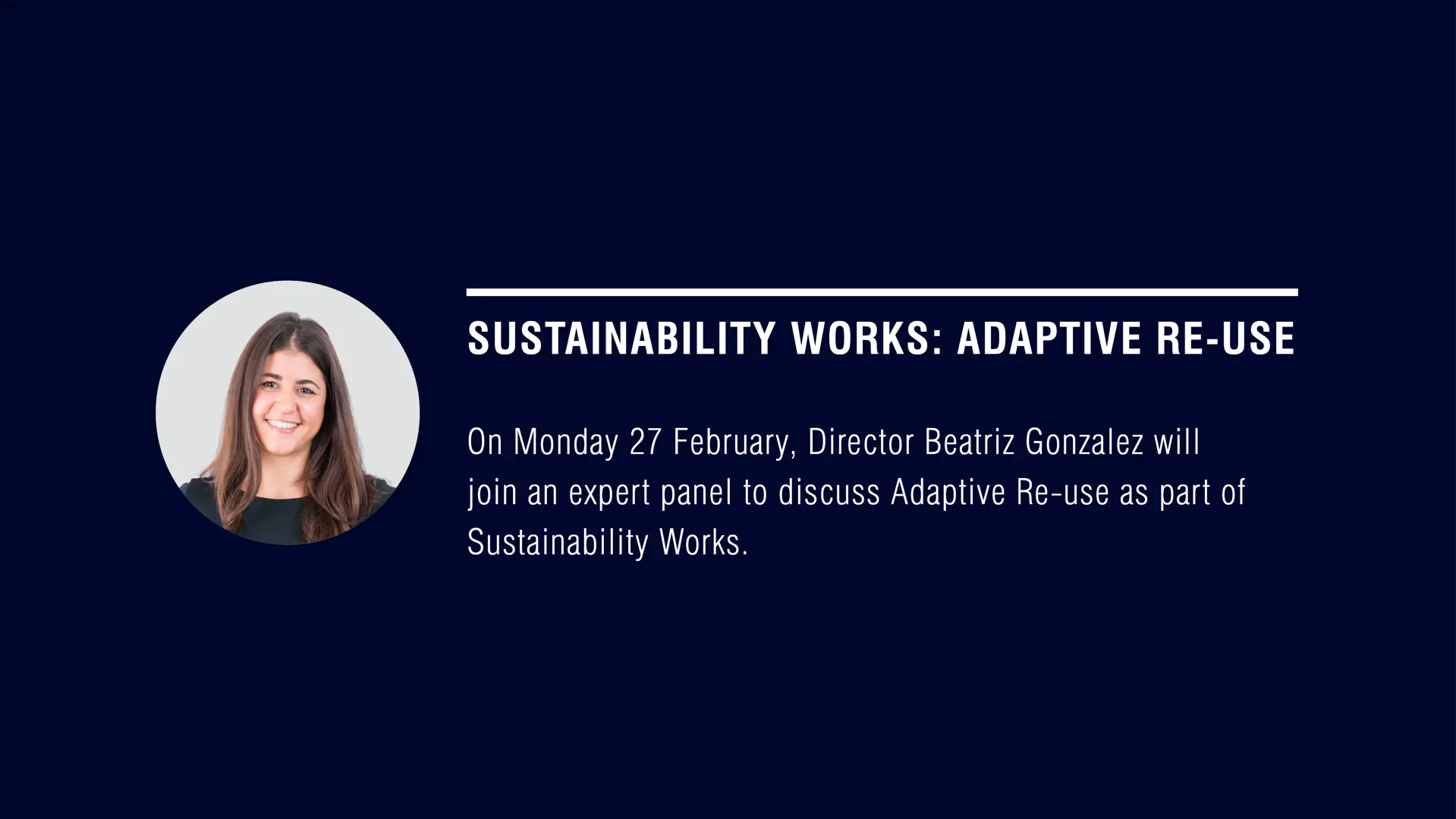 At 11.55am on Monday 27 February, Director Beatriz Gonzalez will join an expert panel to discuss Adaptive Re-use as part of Sustainability Works.