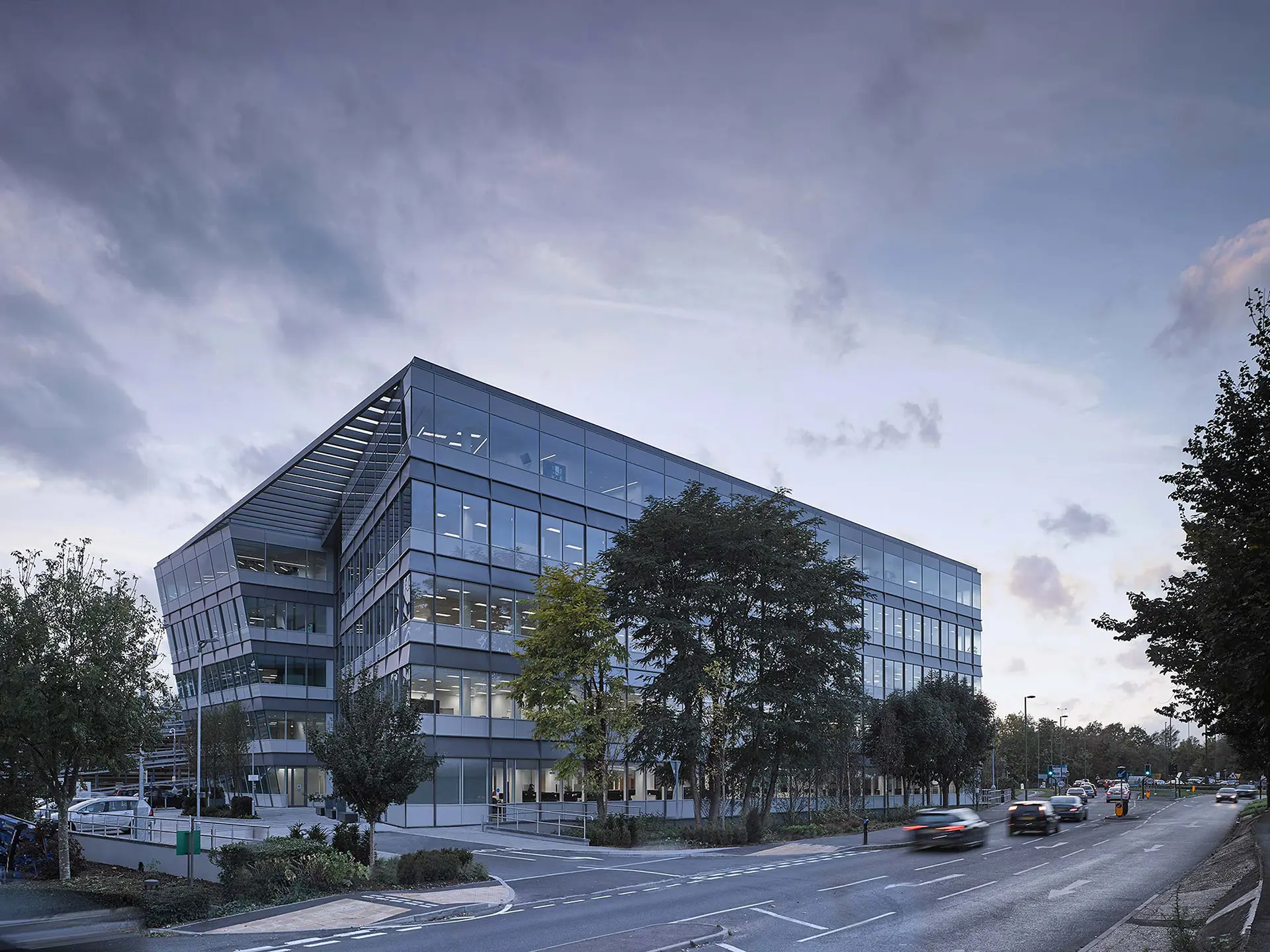 Located within a Flood Zone 3a, flood mitigation has been a key driver for the base build design which has been raised to effectively allow water on and off the site without disrupting the use of the building. The angular form of the architecture presents sharp and defined lines which are reflected in the landscape design. The angled east façade maximises top level floor areas, whilst the fifth floor is column free. The façades are constructed with high performance glazing units within an aluminium curtain walling system, with brise-soleil to the east elevation at roof level over the main entrance.
