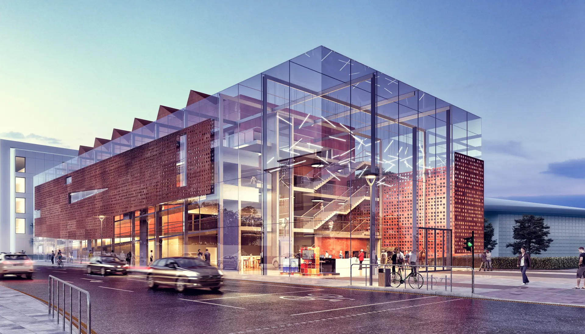 Cardiff Bay’s cultural and social heritage is woven around its history as a port and industrial area. The idea of a ship or industrial container as an appropriate vessel to hold the exhibits and artefacts is used to root the building within its ‘genius loci’. To this end, the main body of the museum is conceived as a floating industrial form with the expressed north lights covered in corten steel cladding. This is then subsequently wrapped on two sides by the glazed atrium entrance and circulation spaces – enabling movement to be perceived by the passer-by – adding life and activity. In turn this is partially sheathed in a perforated copper veil. This acts as both a climate modifier (solar shade) as well as a further expression of the concept (the translucency aspect of the semi-private).