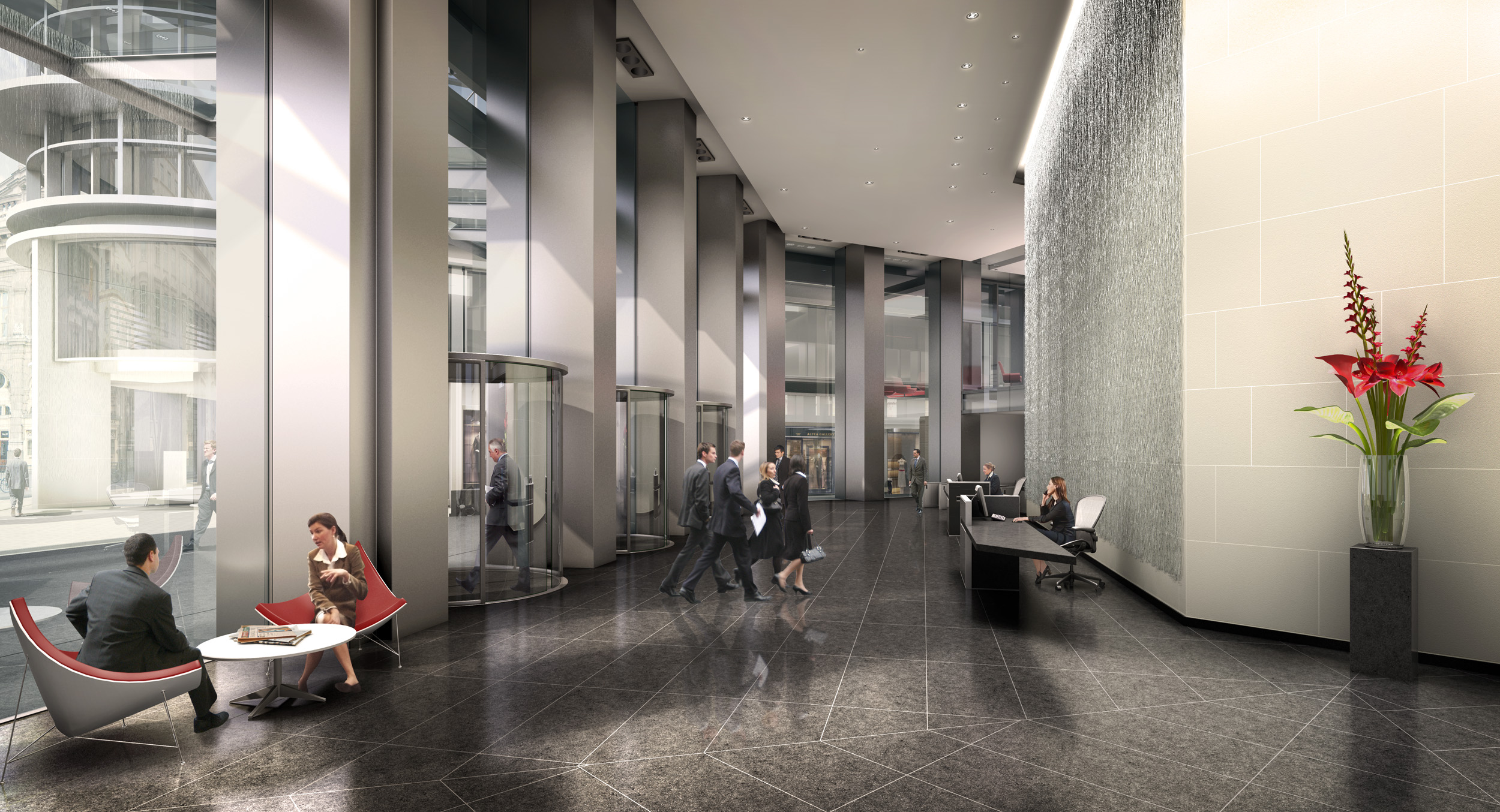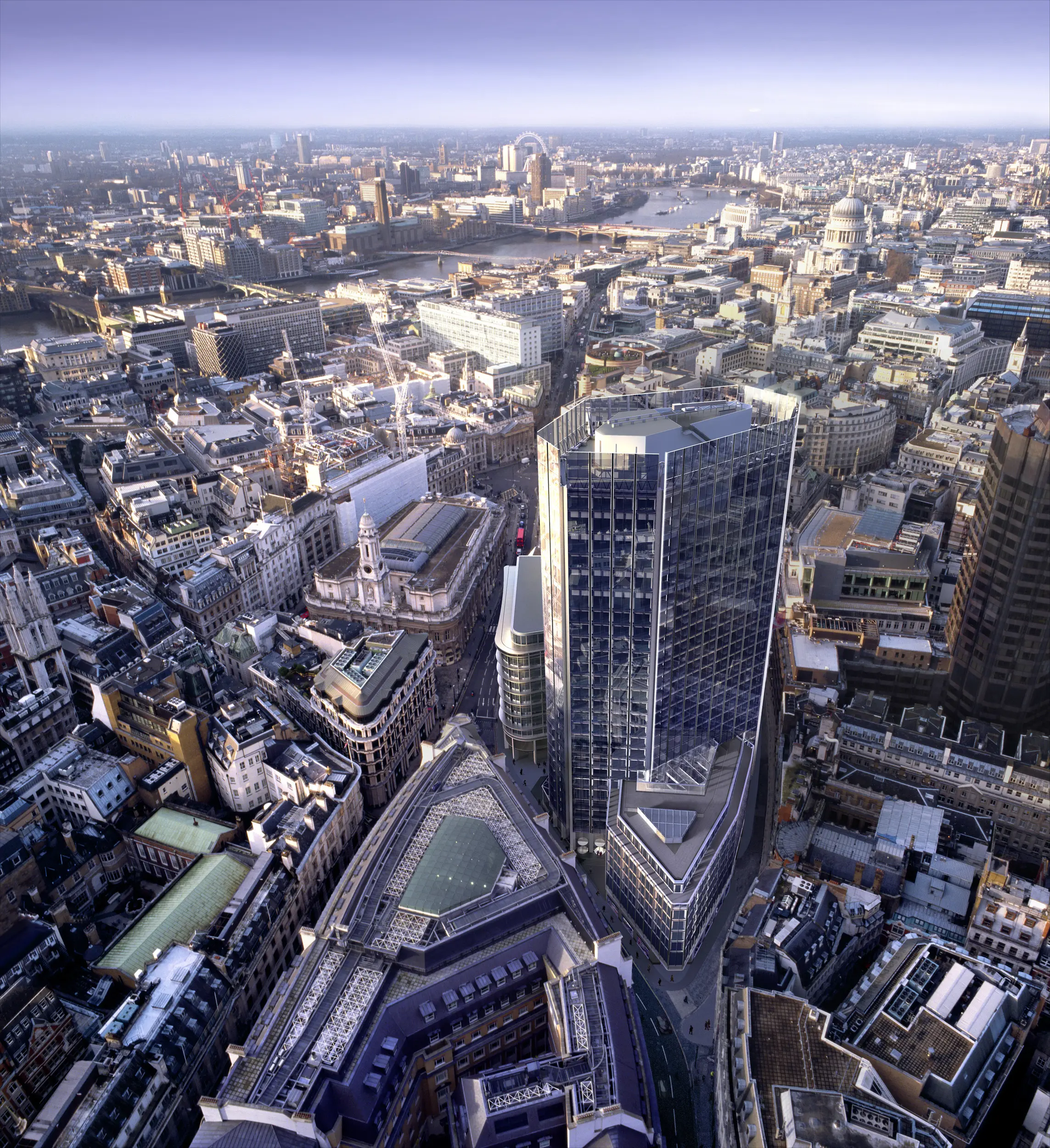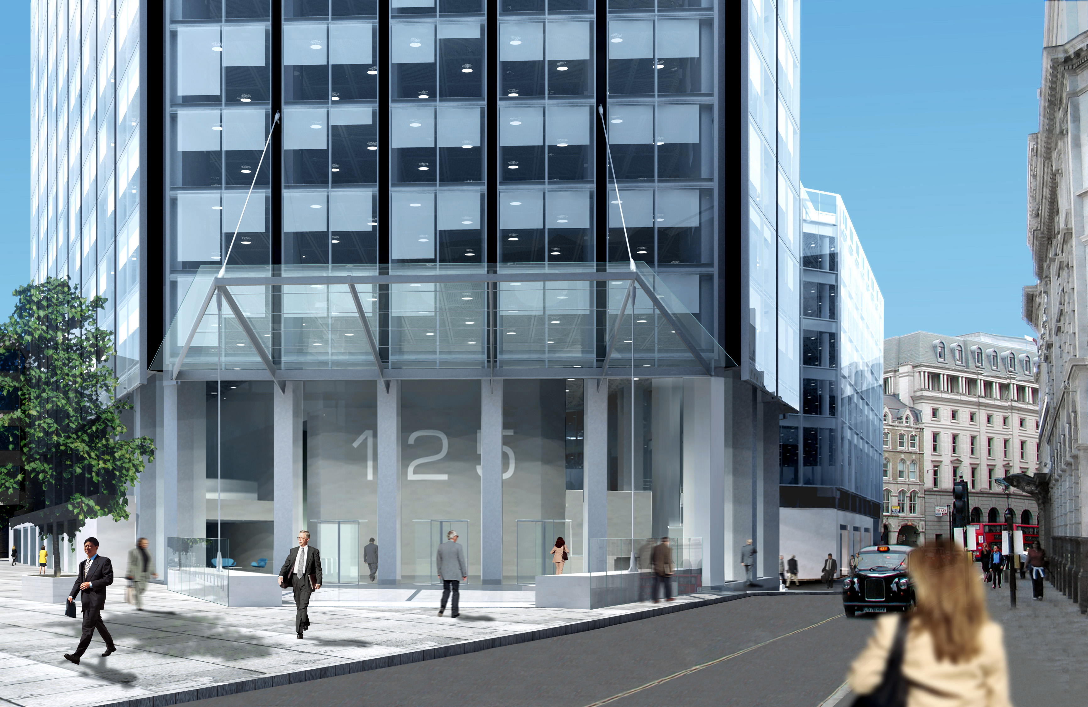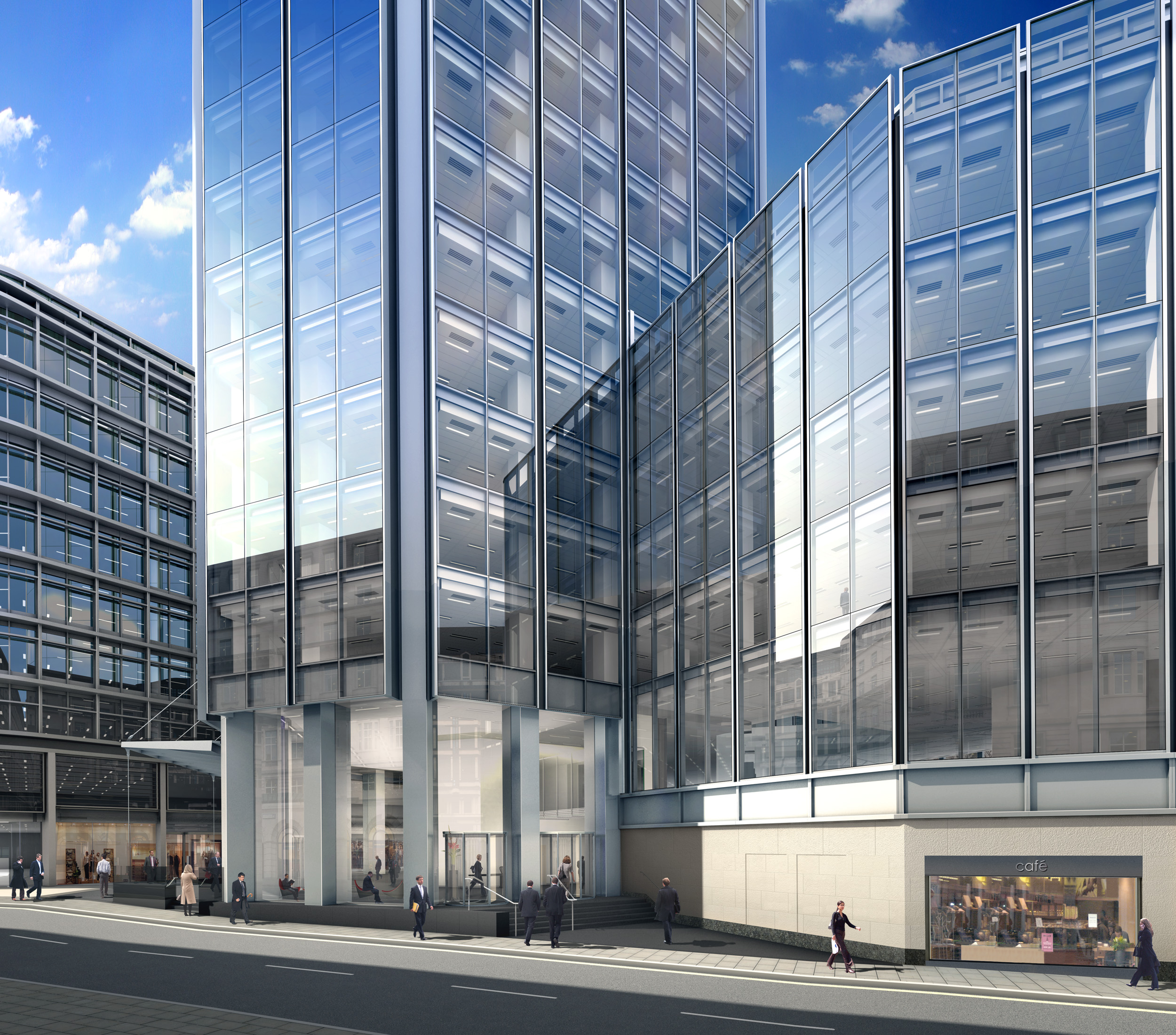 The uppermost translucent cladding panels soften the transition between building and sky. The original podium has been demolished and a new seven-storey building constructed in its place, providing the six lower levels with floors of approximately twice the area of the tower floors above. The ground floor has been opened up for retail and restaurant use and creates a lively urban focus for the area.
