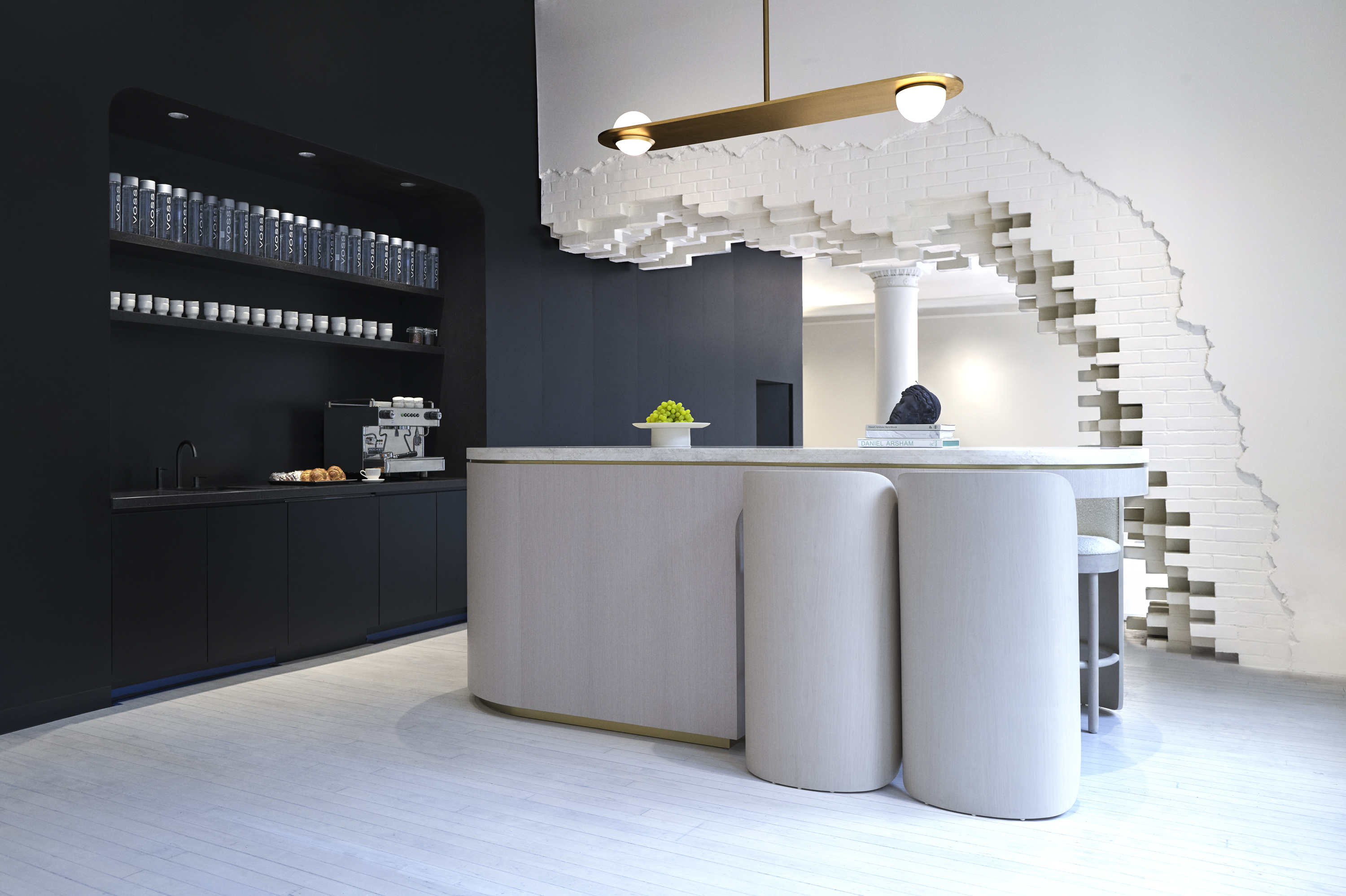 The design concept reflects the artistic spirit of SoHo with unexpected and memorable moments that both contrast and complement the 20th century buildings character. White walls, striking black ornamental surfaces and unique art installations by New York-based contemporary artist Daniel Arsham creates an environment more akin to an art gallery than typical workspace.