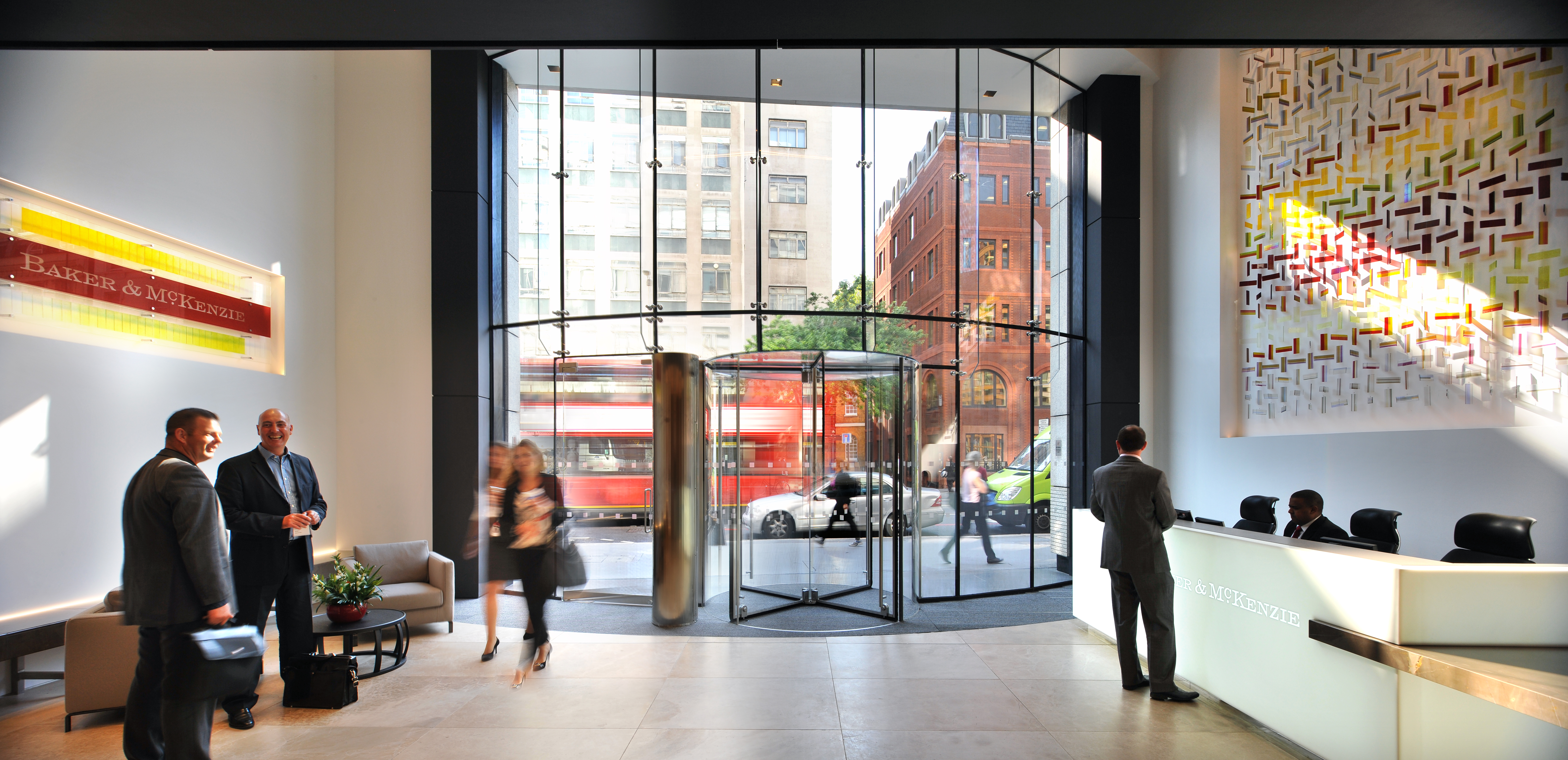 The reception incorporates a bespoke, kiln-formed, glass installation by UK artist Amy Cushings which uses a deconstruction of the Baker & McKenzie logo to provide a stunning feature within the space.