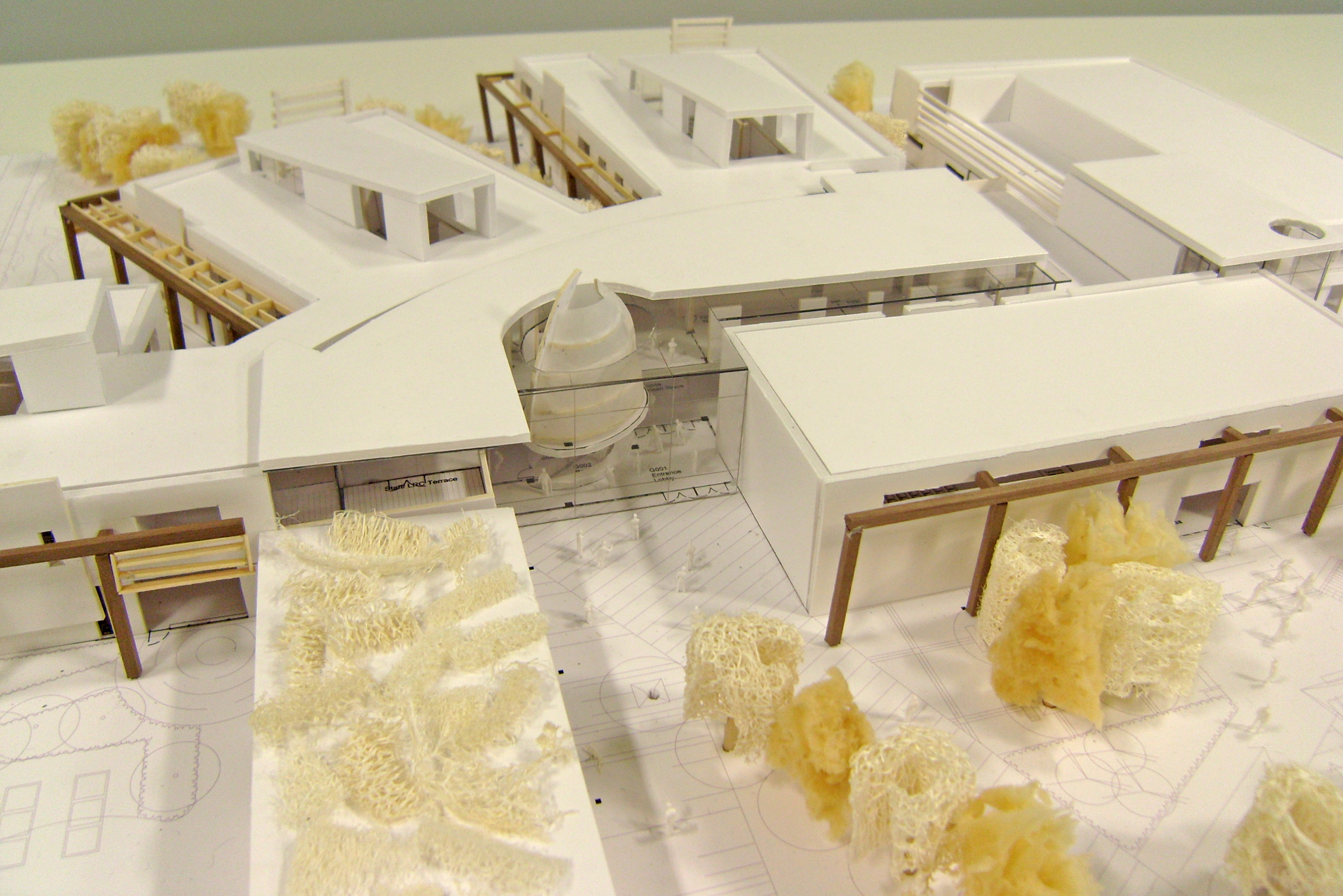 Framing the north side of the public square is the community pool – it is conceived in a different material, using standing seam metal that slopes and wraps to the ground.