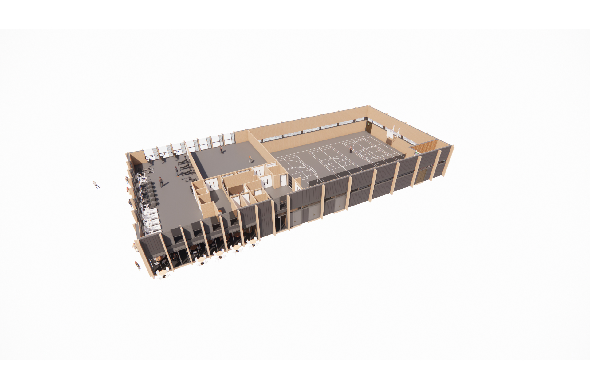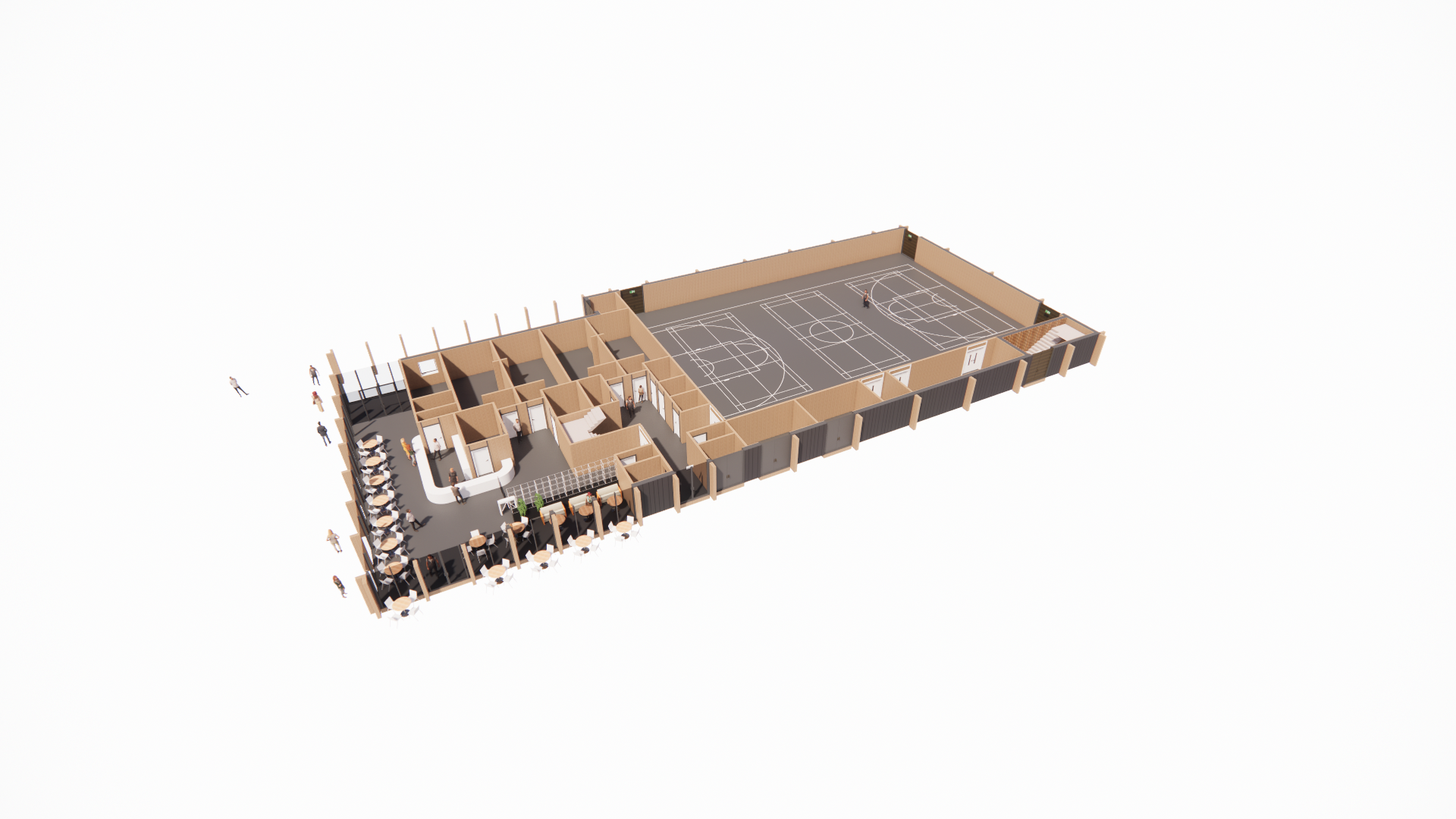 A new-build Wellness Centre for New City College and the local community at the gateway to a new public park and residential development. Our design incorporates a multi-use sports hall with spectator seating to Basketball England ‘Premier Level’ U-18 requirements, fitness equipment studio, activity studio, assessment and physiotherapy room, changing suite and café.
