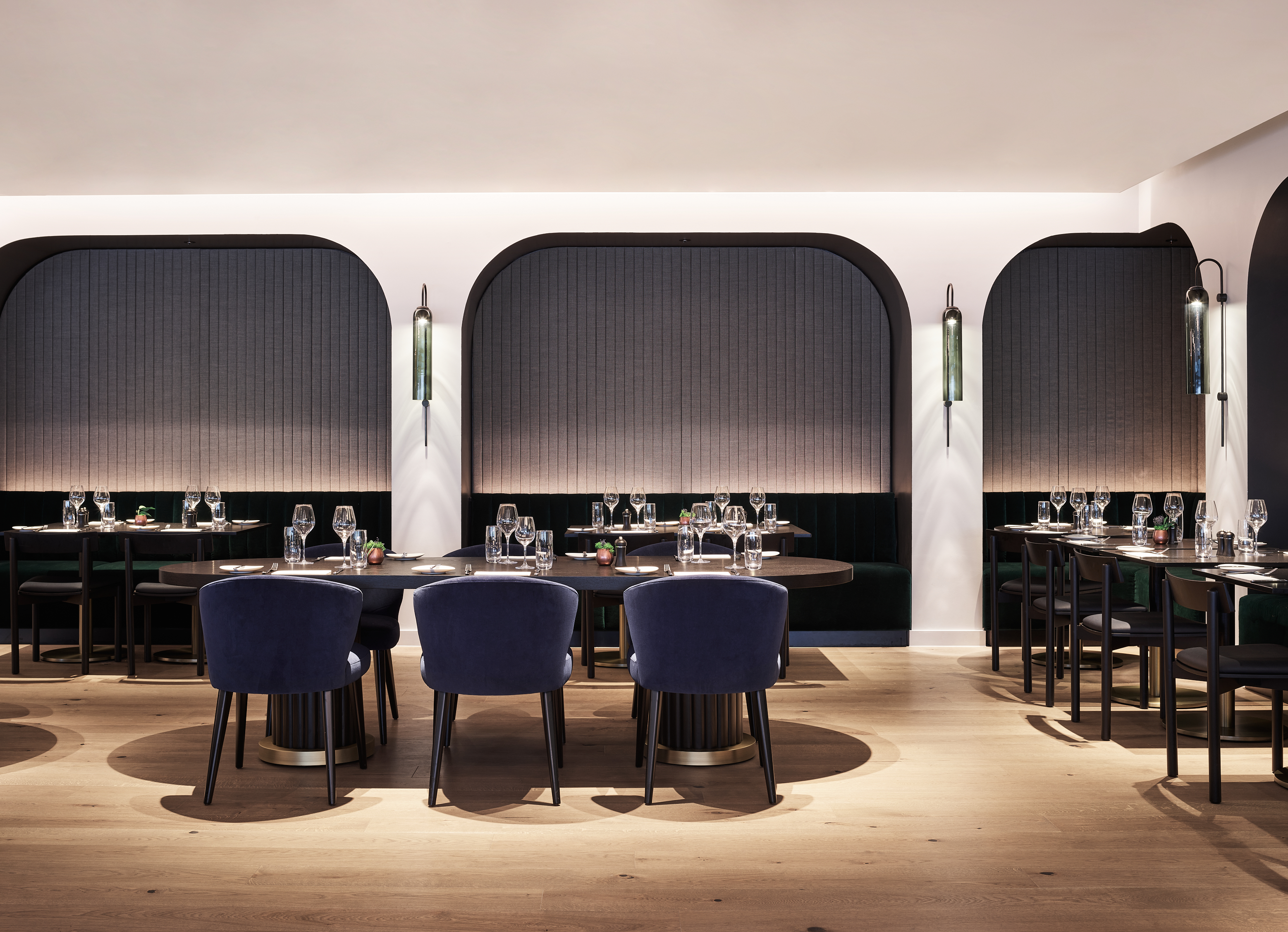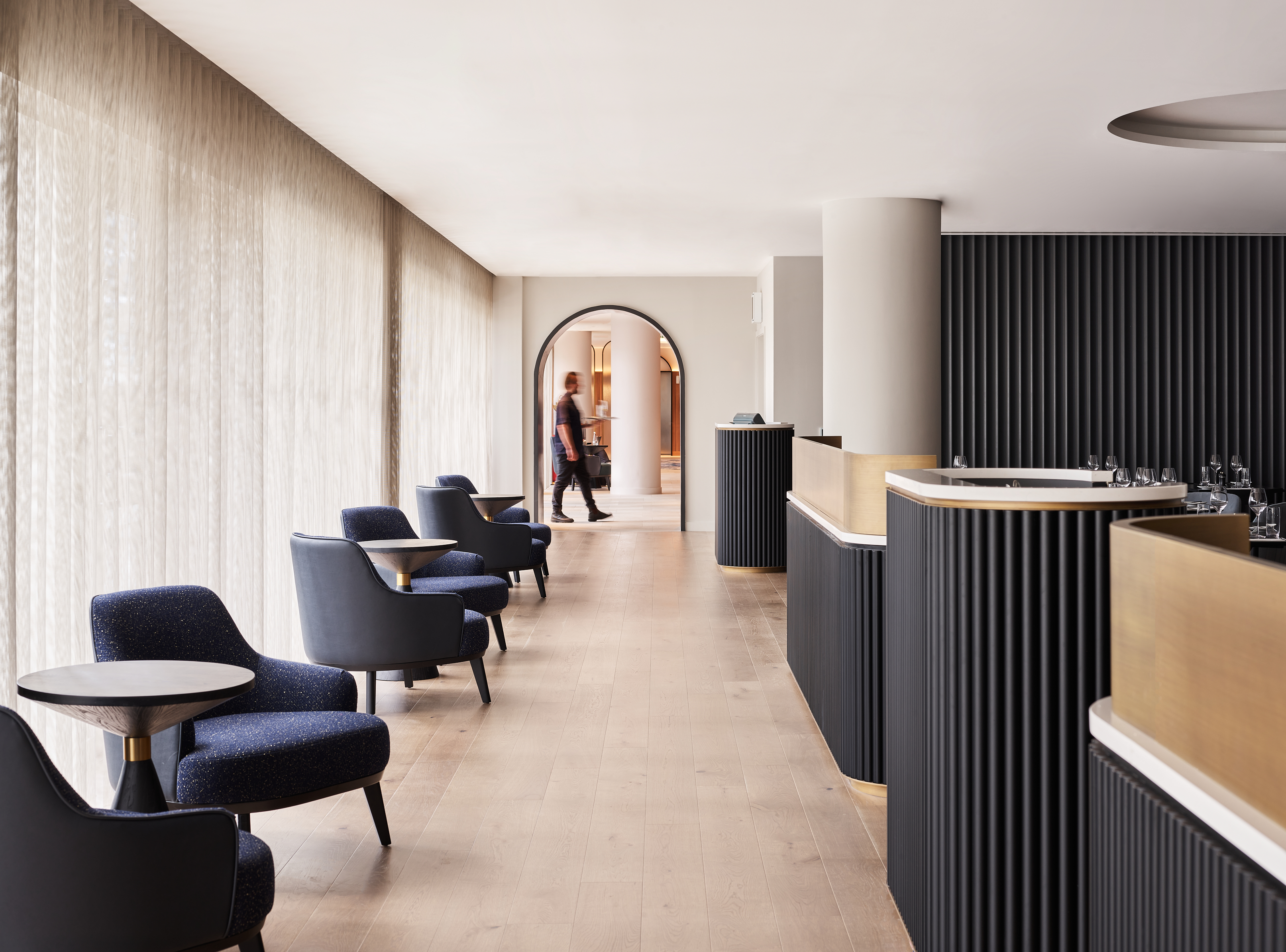 Designed to cater for a seamless transition from work to play, a spacious lobby on the third floor features a range of seating arrangements ideal for socialising or for focused work or meetings during the day, and intimate dining and cocktails at night. Bar and dining booths, with fixed seating and contemporary fluted detailing, are an understated nod to a Victorian railway carriage and provide an elegant feature along the perimeter of each space. Guests also enjoy access to 6,673 sq ft of meeting space, gym and an openair terrace.