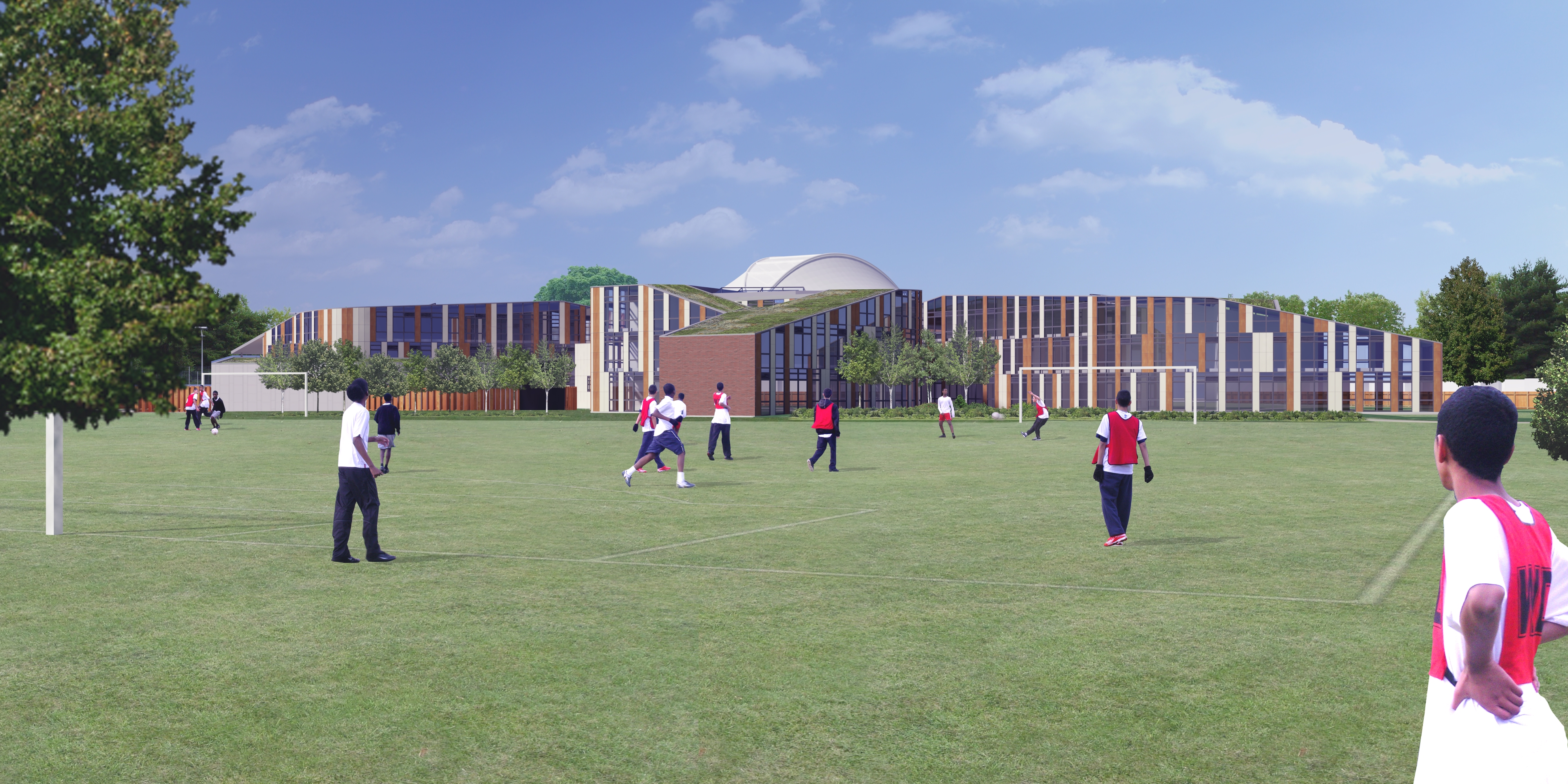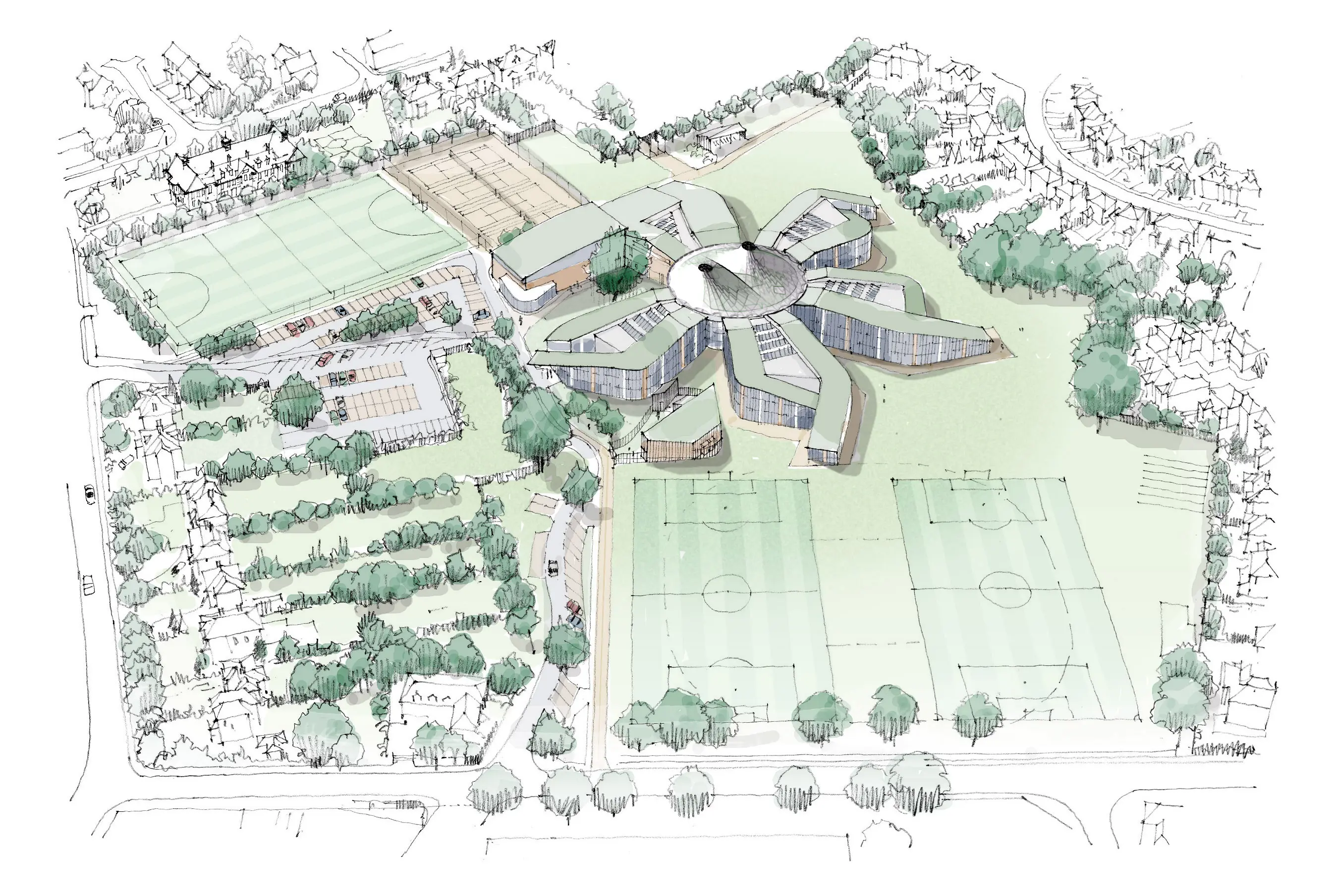 Our concept for this 1,650 place school with sixth form expresses the school’s house structure and takes inspiration from nature. The plan form is flower-like and each ‘petal’ is occupied by one of the School’s five houses. Each ‘petal’ features a full-height project based learning space surrounded by teaching accommodation.