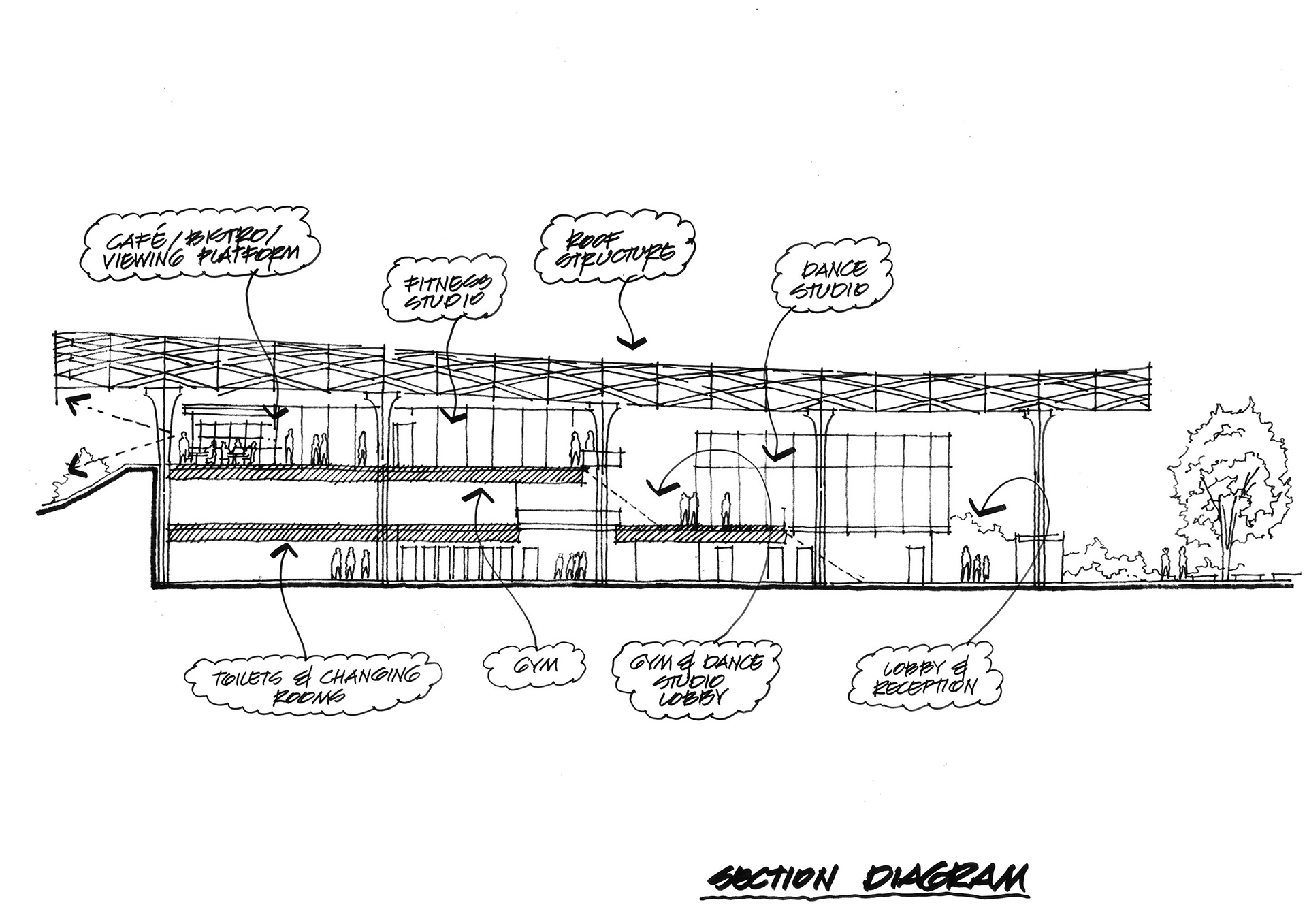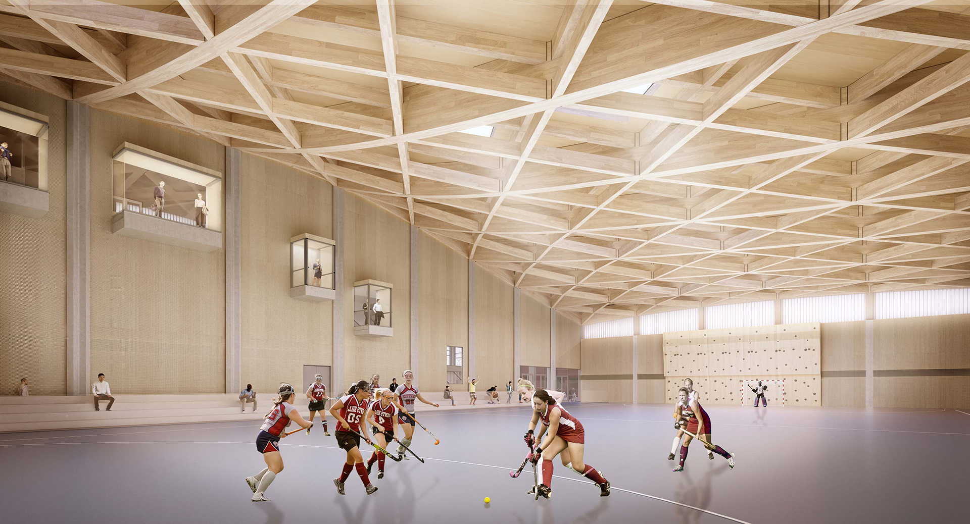 We were commissioned to design an activity centre to be located in the Greenbelt on the College’s Grade II listed park. Our design comprises a 6-court sports hall (with premier level indoor hockey identified as the primary sport), climbing wall, large fitness suite, dance studio, changing facilities and flexible multi-use spaces for group activities, meetings, presentations, exhibitions, open days and ‘match teas’.
