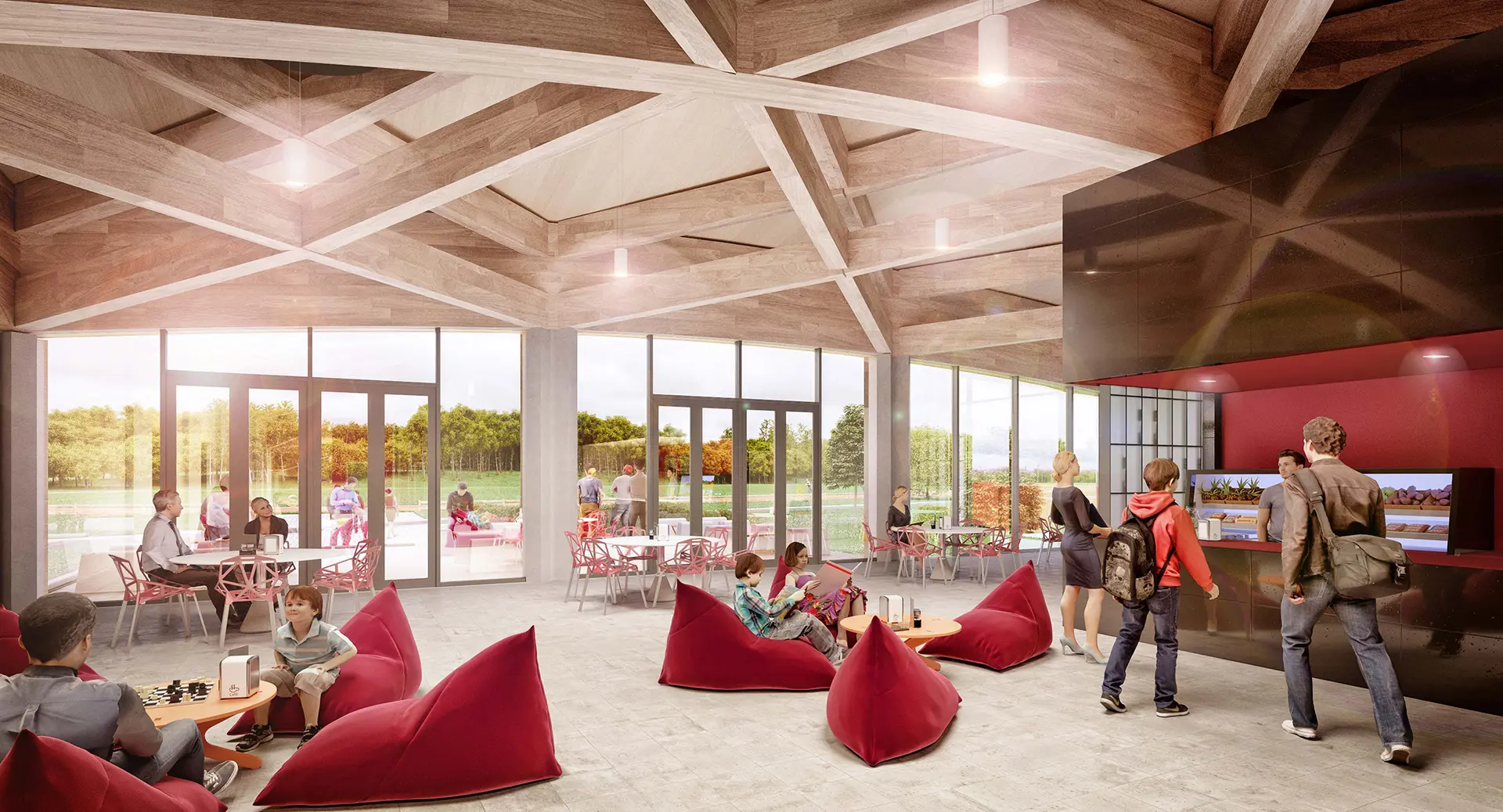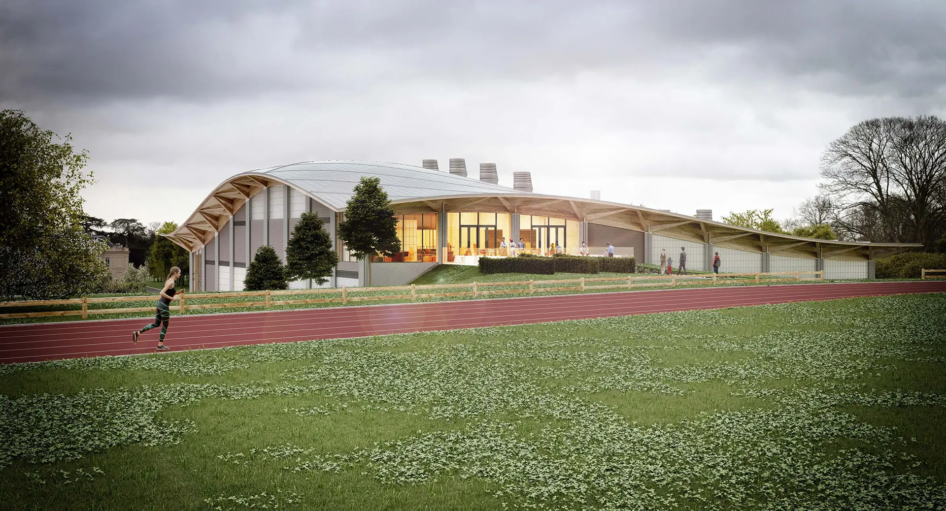 We wanted to create a feature green roof that was at one with its surroundings. Our response was an undulating roof with an exposed timber structure that defines the building form and the distinctive, cathedral-like spaces within. This visually striking element blends the large hall spaces into the landscape, pushes down to denote the main entrance and pulls up to frame views of the athletics track.