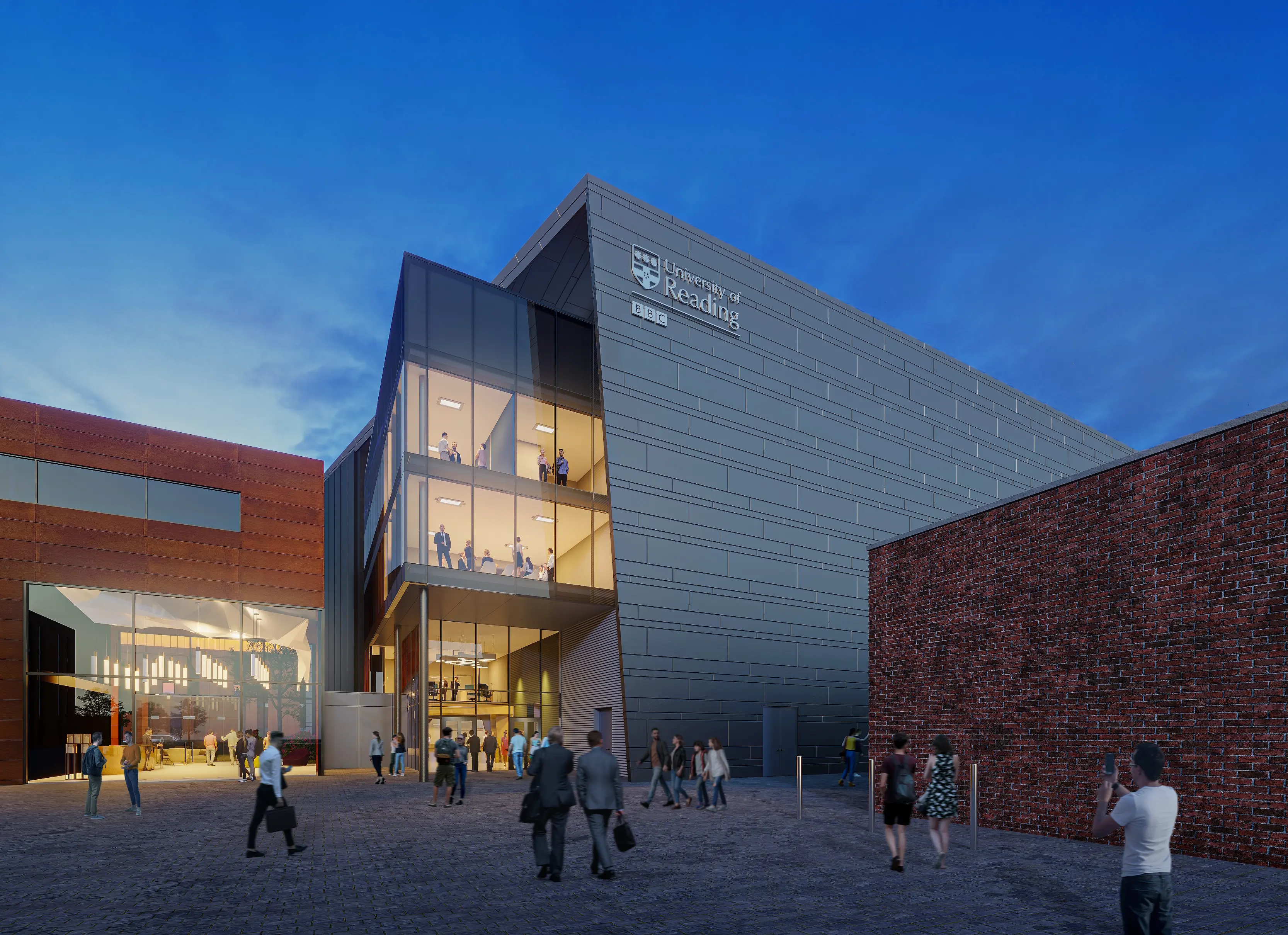 The first two floors are pushed back to create a protective canopy with the production facilities and talent room above. The materials have been chosen to be sympathetic to the existing Gateway 1 building, aiding in evolving the masterplan naturally. The development will also uphold values of environmental sustainability, supporting the University’s aim to become carbon neutral by 2030.