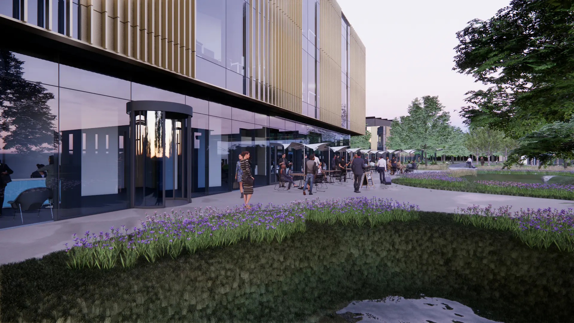 The design has a striking external appearance, with a daring entrance attraction that celebrates arriving at this centre for collaboration and innovation. Alongside a double height reception, a contemporary café